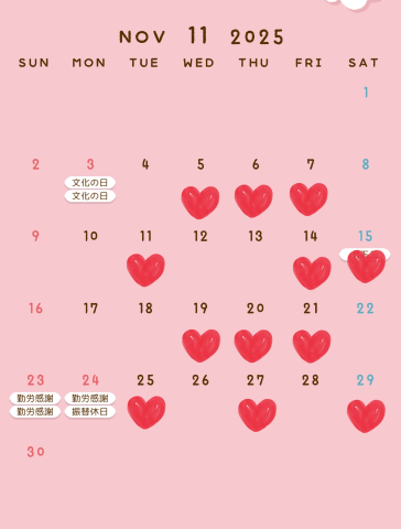 だんだんと寒くなってきて人肌恋しく密着したい時期だねひなと密着する??こちら来月の出勤予定となりますハートのマークが出勤日となります♪♪?