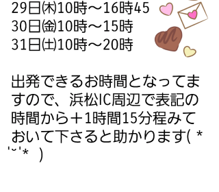【I様@アスタプロント】早々の再会をありがとうございました貴重なおひとりさま時間に事前に予約して下さり嬉しかったですあれから静岡へ戻るタイミングで教えて頂いた所へ行ってきましたよ例の餃子は無かったけど美味しそうなの色々あって楽しかったです教えてくれてありがともう一つの所も気になる〜昨日も楽しいお時間をありがとうございましたまたお誘い楽しみに待ってます〜【K様@浜松駅周辺】初めましてでした〜2人利用でご準備して下さり安心してホテルが使うことができてありがとうございますお話を伺ってると、ご自身で色々調べてどう歩んでいこうか良く考えてらして本当に感心させられました帰りにバスまで見送るよって言ったら大丈夫ー!って仰って帰られるその背中に眩しさと逞しさが有りましたよ応援しております昨日はありがとうございましたまたお誘い頂けたら嬉しいです