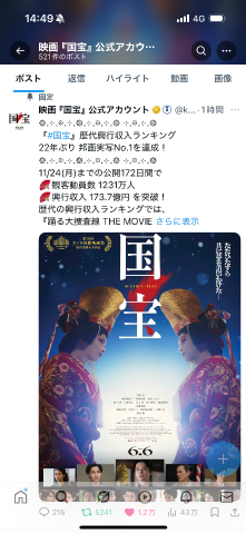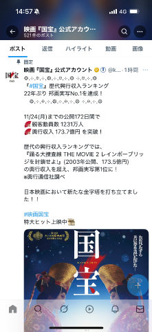 映画『国宝』歴代興行収入ランキング22年ぶり邦画実写1位を達成興行収入200億円越えも射程圏内に入ってきました私はいろいろ忙しくて3回目が見に行けていませんが12月中旬くらいに3回目見に行きたいと思っています3時間くらいの映画ですが内容で作品に没入し、映像美&音楽&出演俳優陣の素晴らしい演技に魅了されて3時間なんて時間が全く気になりません同じ映画を映画館に2度見に行ったのは人生初です映画『国宝』は映画館の大きなスクリーンで見るべき作品です年明けの1月中旬くらいまで映画館でやっててほしいなそしたら、冬休み中のまだ見ていない学生さんたちも見れるしリピ見の人たちもあと1回〜2回見に行けるもんねつきより浜松店出勤予定11月27日(木)16時〜0時11月28日(金)10時〜0時11月29日(土)10時〜0時ご予約いただいているお客様ありがとうございますお会いできる日を今から楽しみにしてます*12月の浜松店出勤予定は今のところ未定です*?