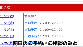 深夜に失礼します日付変わりましたが昨日お誘いくださったあなたありがとうございましたお礼はあらためていたします金曜日は12時から出勤となりますご予約、お誘いお待ちしてますそして‥12/1の出勤の件ですが前日までにもう少し早い時間のお問い合わせは可能となりますメッセージなどいただけたらと思います終了時間は FIGHT ON行ってきますので融通ききません(_ _)ご了承くださいませかなり夜は冷えてきました暖かくしてねおやすみなさいzz